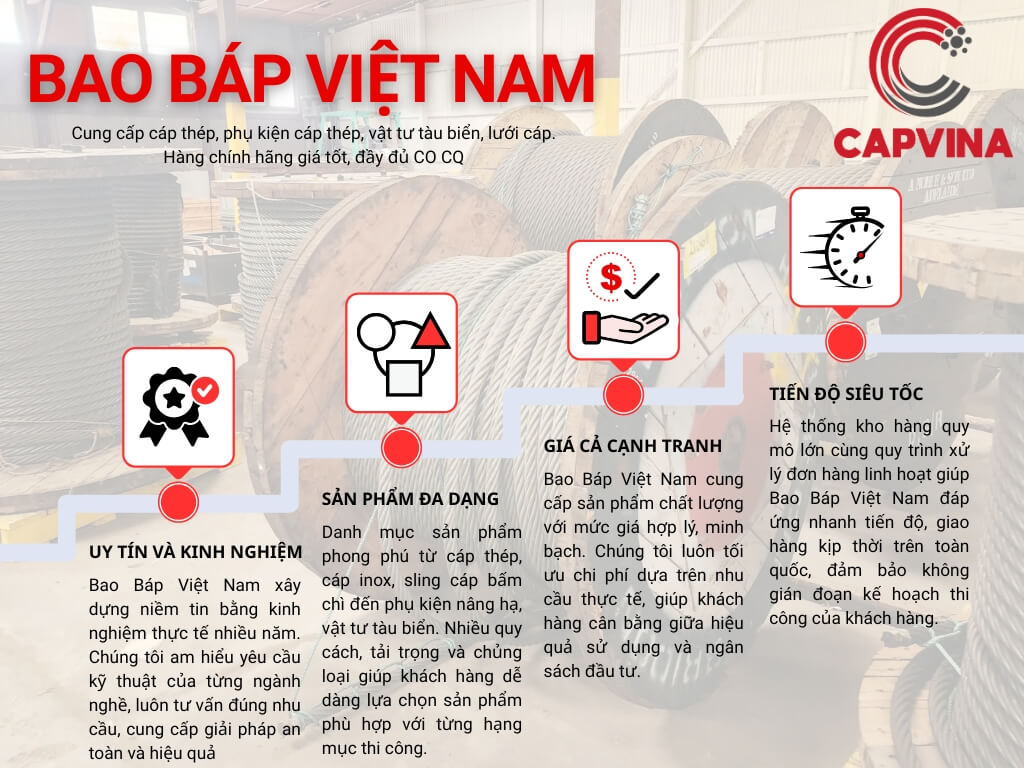 Bao Báp Việt Nam là đơn vị uy tín hàng đầu trong lĩnh vực nhập khẩu và phân phối cáp thép, thiết bị nâng hạ và vật tư công nghiệp tại thị trường Việt Nam. Chúng tôi chuyên cung cấp đa dạng các sản phẩm như cáp thép, phụ kiện cáp, lưới cáp, vật tư tàu biển… phục vụ khách hàng và đối tác trên toàn quốc.