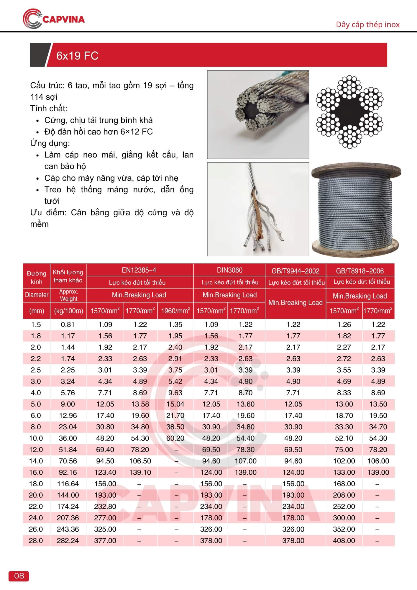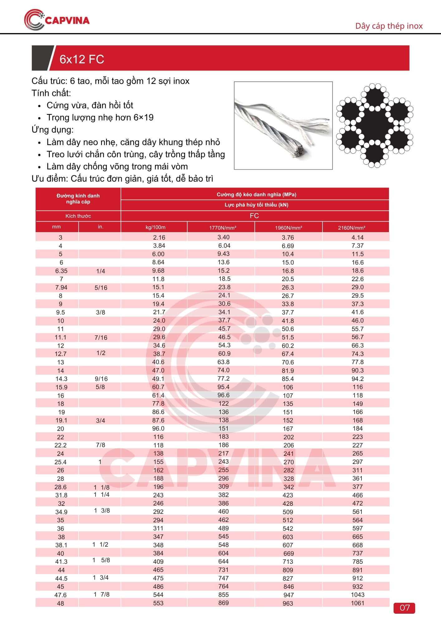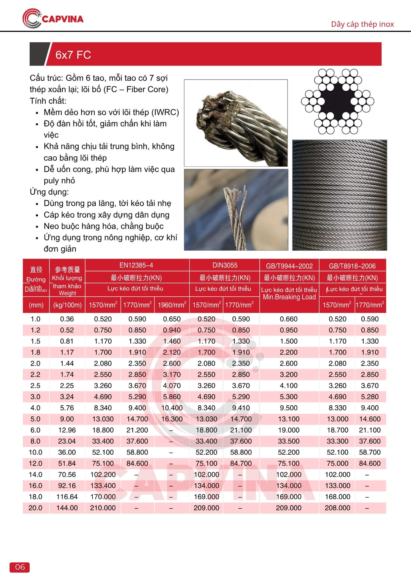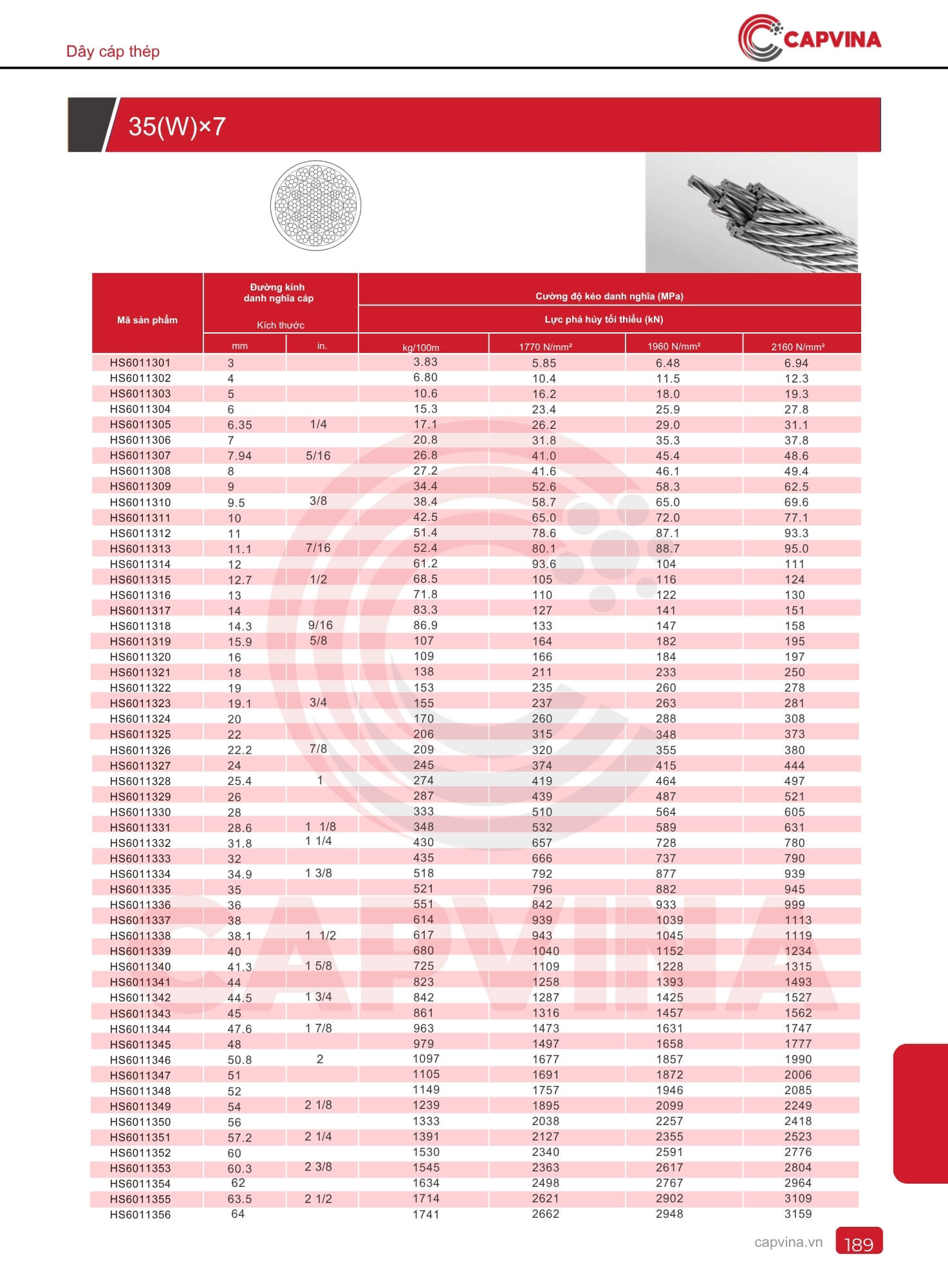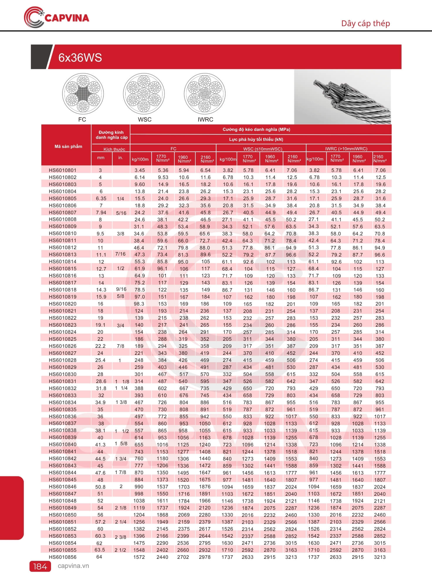 - Cấu trúc cáp: 1×7, 7×19, 6×36, 8×19…