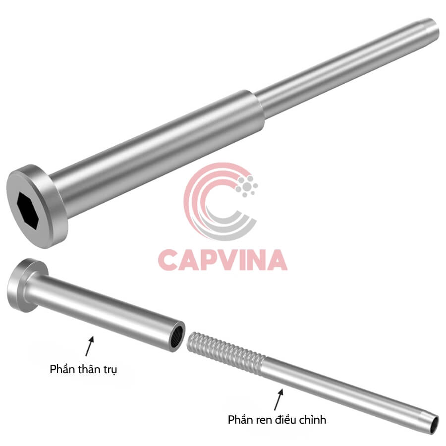 - Phần ren điều chỉnh: Phía đầu của thân trụ có một bộ phận được thiết kế với ren ở bên trong. Bằng việc xoay phần đầu ren này, người dùng có thể dễ dàng điều chỉnh độ căng của cáp lan can mà không cần cắt bỏ phần ren thừa.