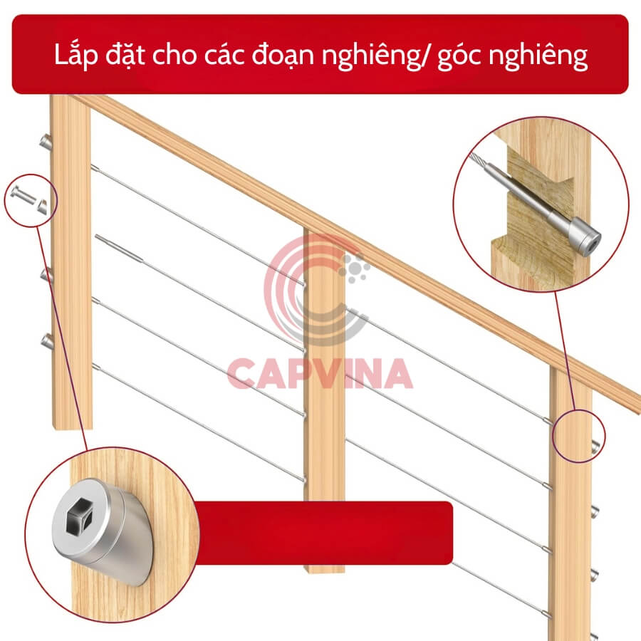 Ngoài ra, bộ tăng đơ inox cũng được ứng dụng tại các đoạn nghiêng/ góc nghiêng tạo độ thẩm mỹ cho không gian